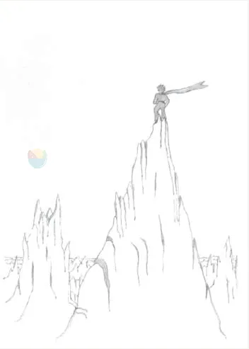 在那之后,小王子爬上了一座高山。他以前见过的山只有那三座高及膝盖的火山,他甚至把那座死火山当成垫脚的小凳子。他自言自语道:“从这么高的一座山上,我一眼就能看到整个星球,还有所有的人……”